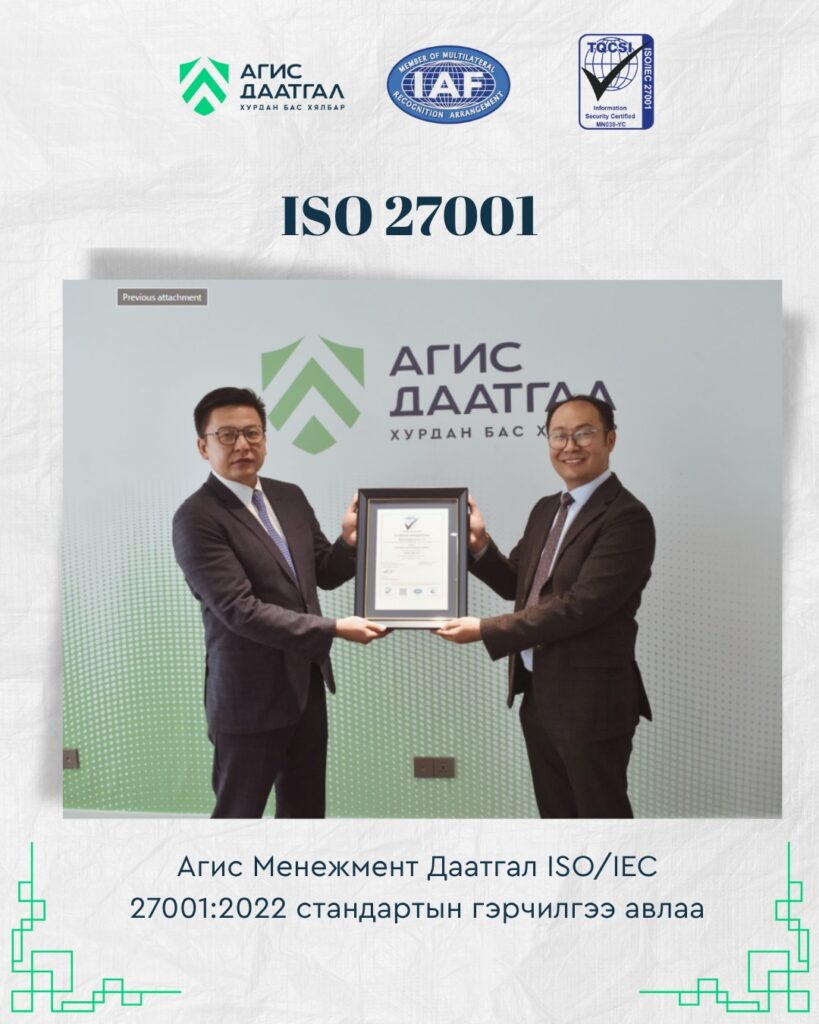 “Агис Менежмент Даатгал” ХХК нь ISO/IEC 27001:2022 Мэдээллийн аюулгүй байдлын менежментийн тогтолцооны олон улсын стандартын баталгаажуулалтын аудитад амжилттай тэнцэж, гэрчилгээгээ гардан авлаа.